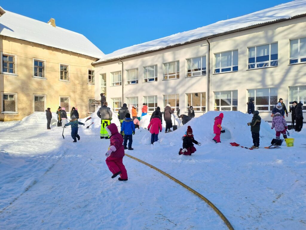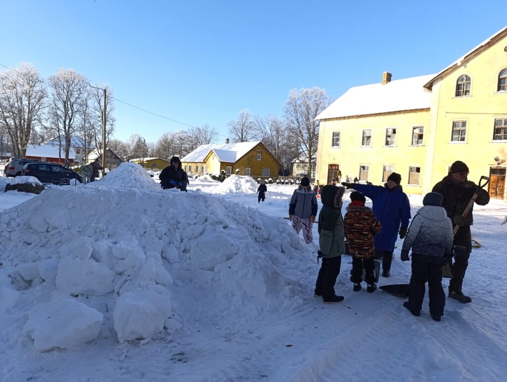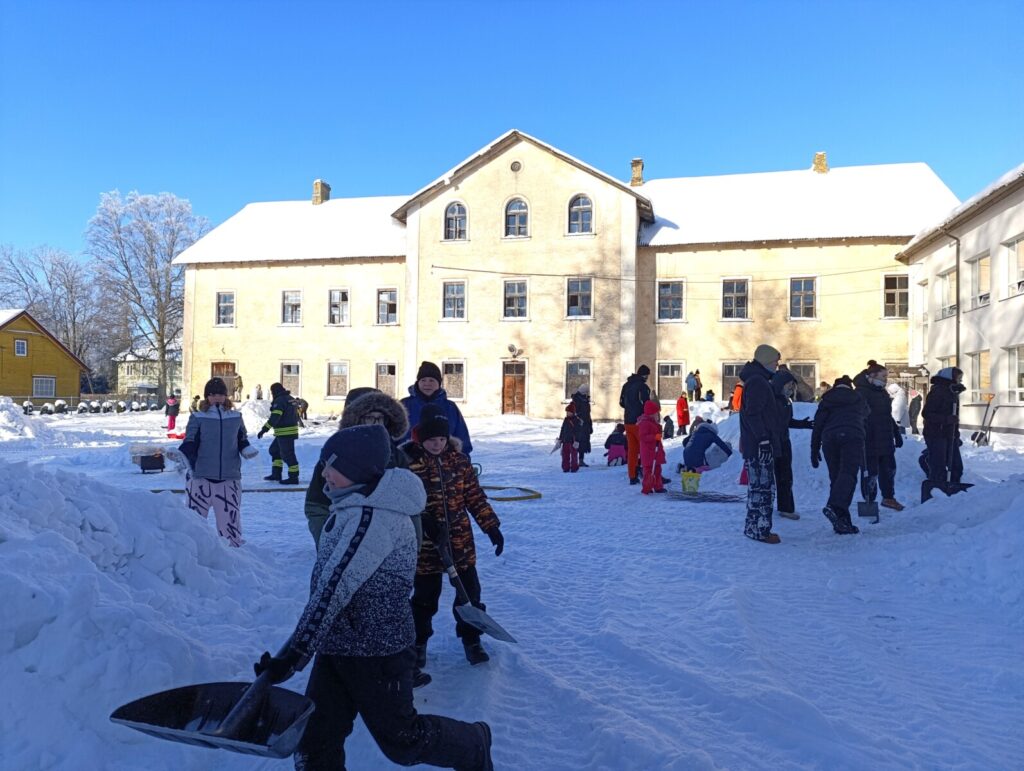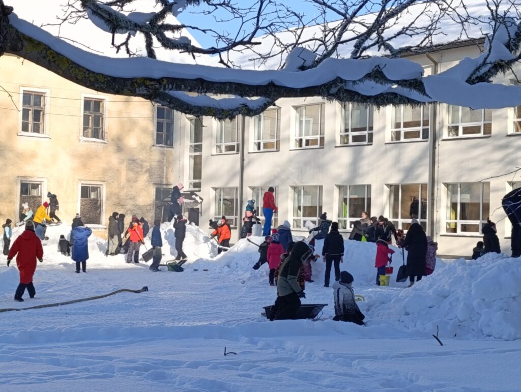 Varsti oli koolihoov punapõsiseid askeldajaid täis, vähehaaval hakkasid lumehunnikud ka kuju võtma.