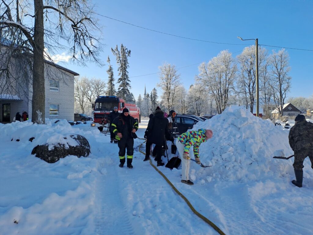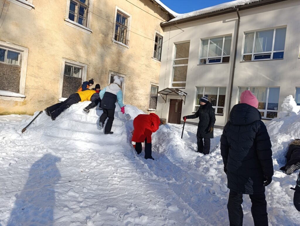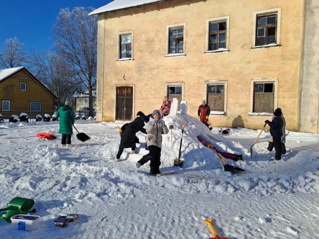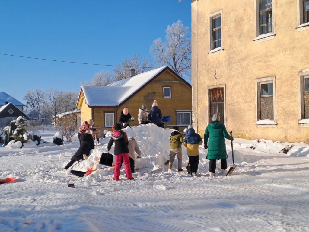 Varsti oli koolihoov punapõsiseid askeldajaid täis, vähehaaval hakkasid lumehunnikud ka kuju võtma.